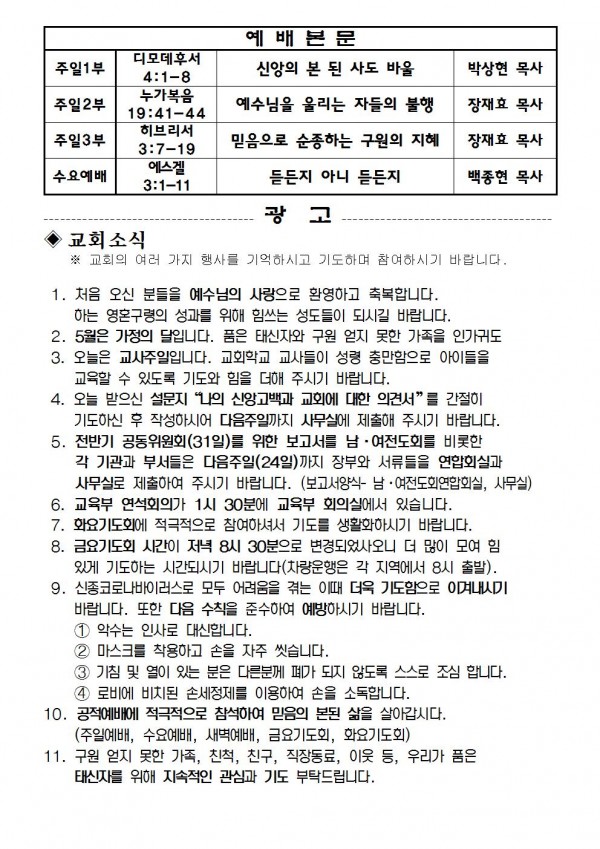 2020년 5월 17일 예배본문 & 교회소식 페이지 정보 작성자 성은교회 작성일20-05-15 17:16 조회7,207회 관련링크 이전글 다음글 목록 본문 2020년 5월 17일 예배본문 & 교회소식 이전글 다음글 목록