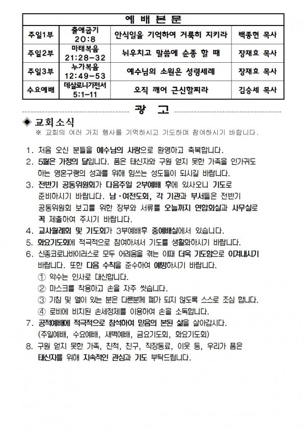 2020년 5월 24일 예배본문 & 교회소식 페이지 정보 작성자 성은교회 작성일20-05-22 16:59 조회7,360회 관련링크 이전글 다음글 목록 본문 2020년 5월 24일 예배본문 & 교회소식 이전글 다음글 목록