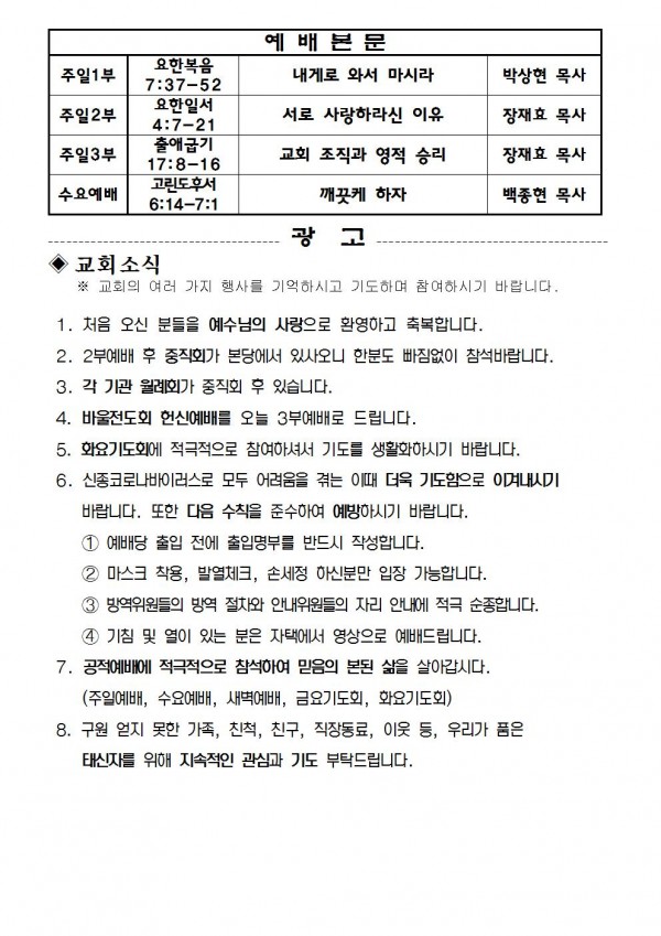 2020년 8월 9일 예배본문 & 교회소식 페이지 정보 작성자 성은교회 작성일20-08-07 16:59 조회7,075회 관련링크 이전글 다음글 목록 본문 2020년 8월 9일 예배본문 & 교회소식 이전글 다음글 목록