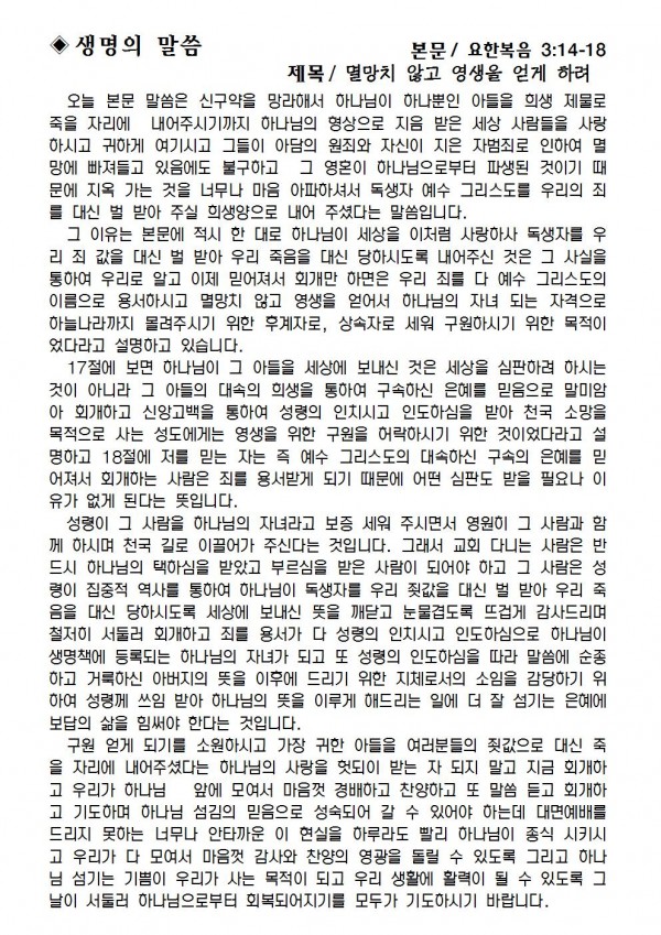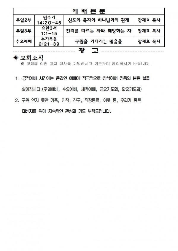 2020년 9월 6일 예배본문 & 교회소식 페이지 정보 작성자 성은교회 작성일20-09-04 16:22 조회7,141회 관련링크 이전글 다음글 목록 본문 2020년 9월 6일 예배본문 & 교회소식 이전글 다음글 목록