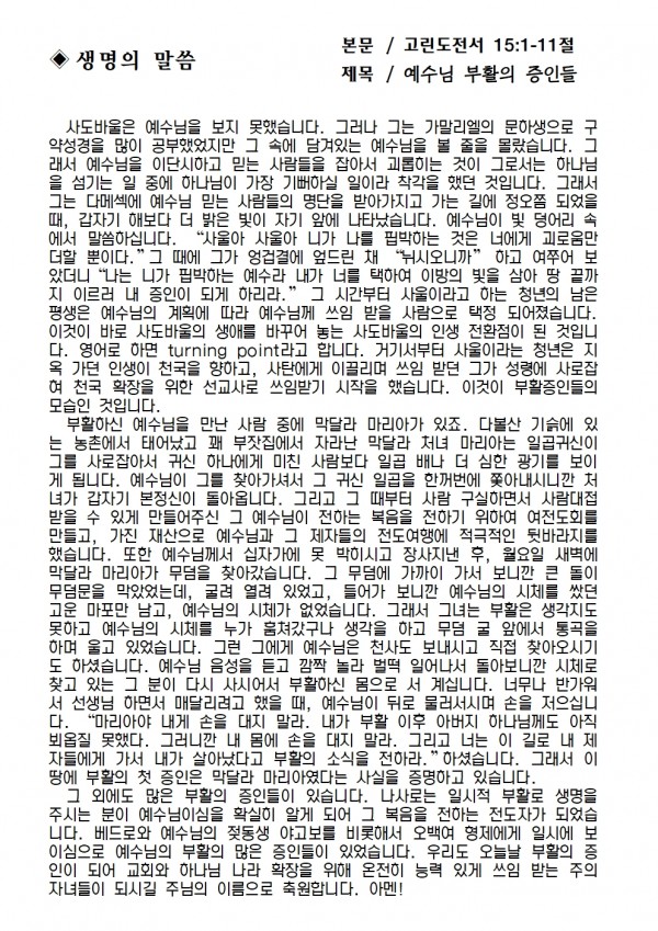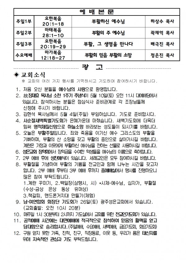 2025년 4월 20일 예배본문 & 교회소식 페이지 정보 작성자 성은교회 작성일25-04-18 12:48 조회2,806회 관련링크 이전글 다음글 목록 본문 2025년 4월 20일 예배본문 & 교회소식 이전글 다음글 목록