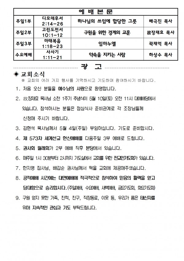 2025년 4월 27일 예배본문 & 교회소식 페이지 정보 작성자 성은교회 작성일25-04-25 18:52 조회2,972회 관련링크 이전글 다음글 목록 본문 2025년 4월 27일 예배본문 & 교회소식 이전글 다음글 목록