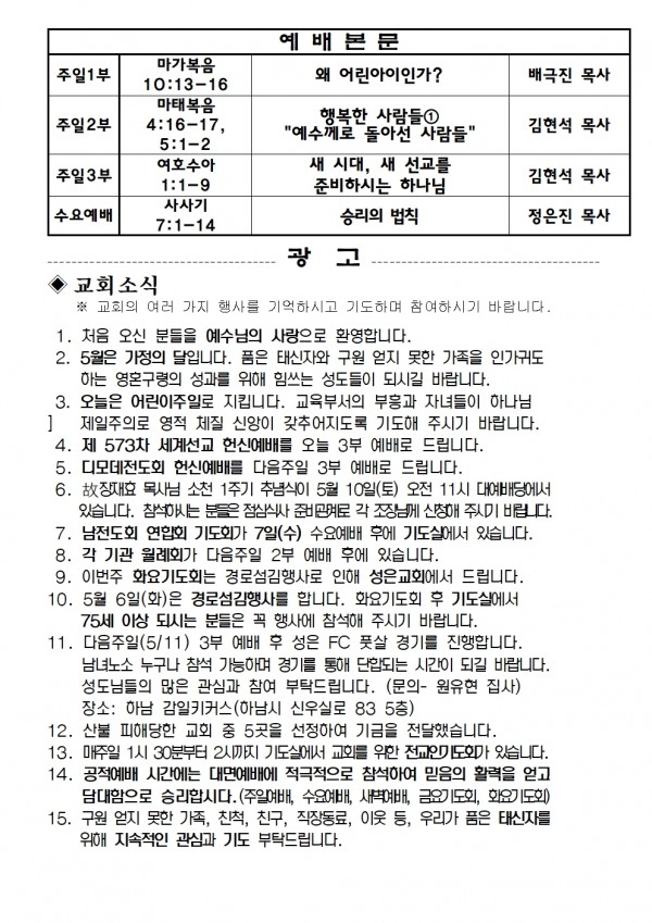 2025년 5월 4일 예배본문 & 교회소식 페이지 정보 작성자 성은교회 작성일25-05-02 18:13 조회2,946회 관련링크 이전글 다음글 목록 본문 2025년 5월 4일 예배본문 & 교회소식 이전글 다음글 목록