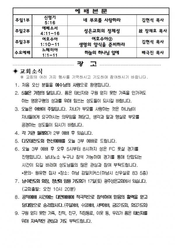 2025년 5월 11일 예배본문 & 교회소식 페이지 정보 작성자 성은교회 작성일25-05-09 17:47 조회2,816회 관련링크 이전글 다음글 목록 본문 2025년 5월 11일 예배본문 & 교회소식 이전글 다음글 목록