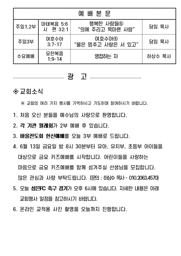 2025년 6월 8일 예배본문 & 교회소식 페이지 정보 작성자 성은교회 작성일25-06-05 19:04 조회2,709회 관련링크 이전글 다음글 목록 본문 2025년 6월 8일 예배본문 & 교회소식 이전글 다음글 목록