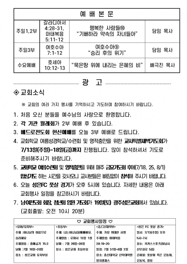 2025년 7월 13일 예배본문 & 교회소식 페이지 정보 작성자 성은교회 작성일25-07-11 11:36 조회2,576회 관련링크 이전글 다음글 목록 본문 2025년 7월 13일 예배본문 & 교회소식 이전글 다음글 목록