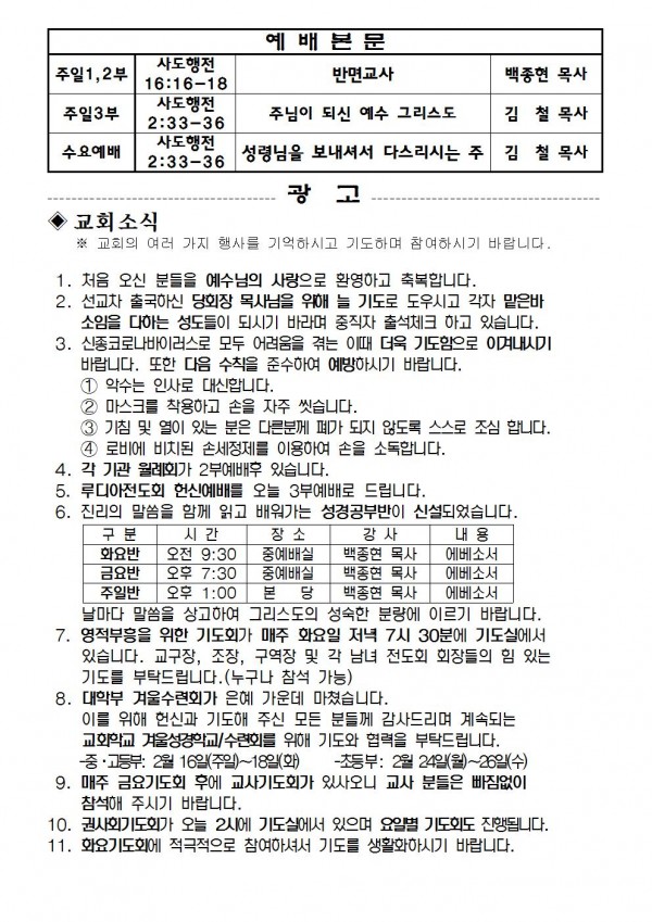 2020년 2월 9일 예배본문 & 교회소식 페이지 정보 작성자 성은교회 작성일20-02-07 16:22 조회7,496회 관련링크 이전글 다음글 목록 본문 2020년 2월 9일 예배본문 & 교회소식 이전글 다음글 목록