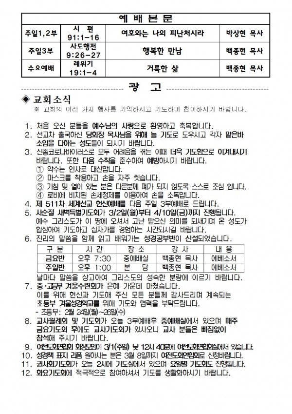 2020년 2월 23일 예배본문 & 교회소식 페이지 정보 작성자 성은교회 작성일20-02-21 17:10 조회7,462회 관련링크 이전글 다음글 목록 본문 2020년 2월 23일 예배본문 & 교회소식 이전글 다음글 목록