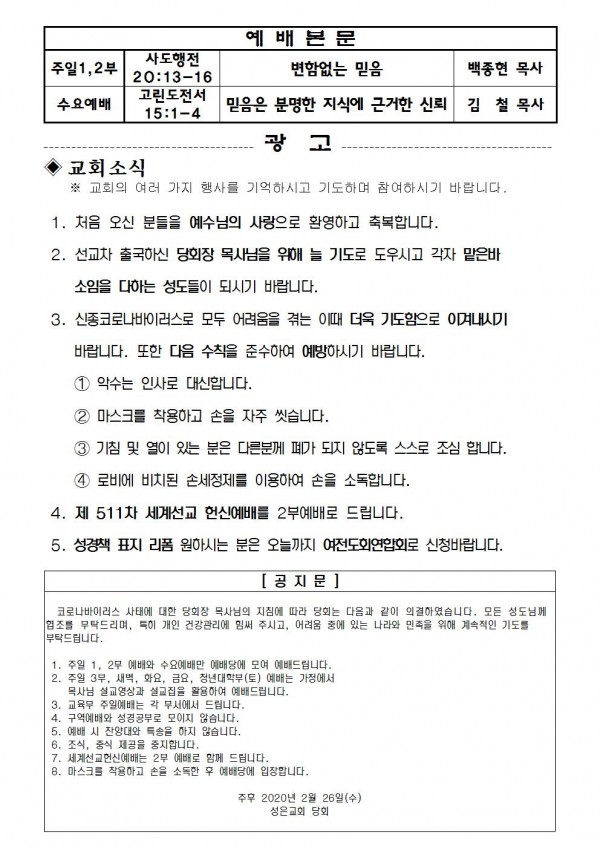2020년 3월 1일 예배본문 & 교회소식 페이지 정보 작성자 성은교회 작성일20-02-28 16:26 조회7,494회 관련링크 이전글 다음글 목록 본문 2020년 3월 1일 예배본문 & 교회소식 이전글 다음글 목록