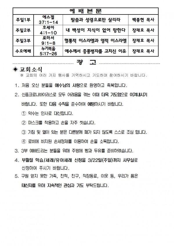 2020년 3월 15일 예배본문 & 교회소식 페이지 정보 작성자 성은교회 작성일20-03-13 17:23 조회7,473회 관련링크 이전글 다음글 목록 본문 2020년 3월 15일 예배본문 & 교회소식 이전글 다음글 목록