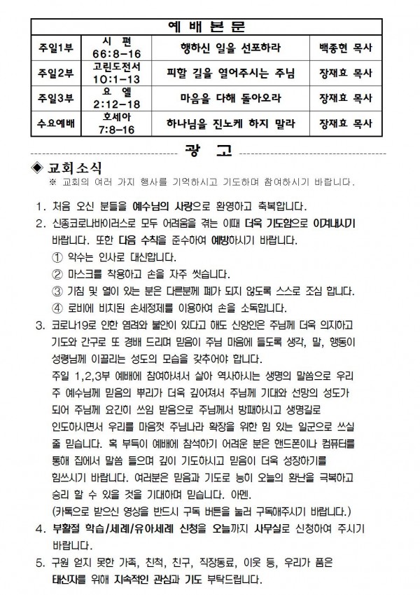2020년 3월 22일 예배본문 & 교회소식 페이지 정보 작성자 성은교회 작성일20-03-20 16:28 조회7,534회 관련링크 이전글 다음글 목록 본문 2020년 3월 22일 예배본문 & 교회소식 이전글 다음글 목록