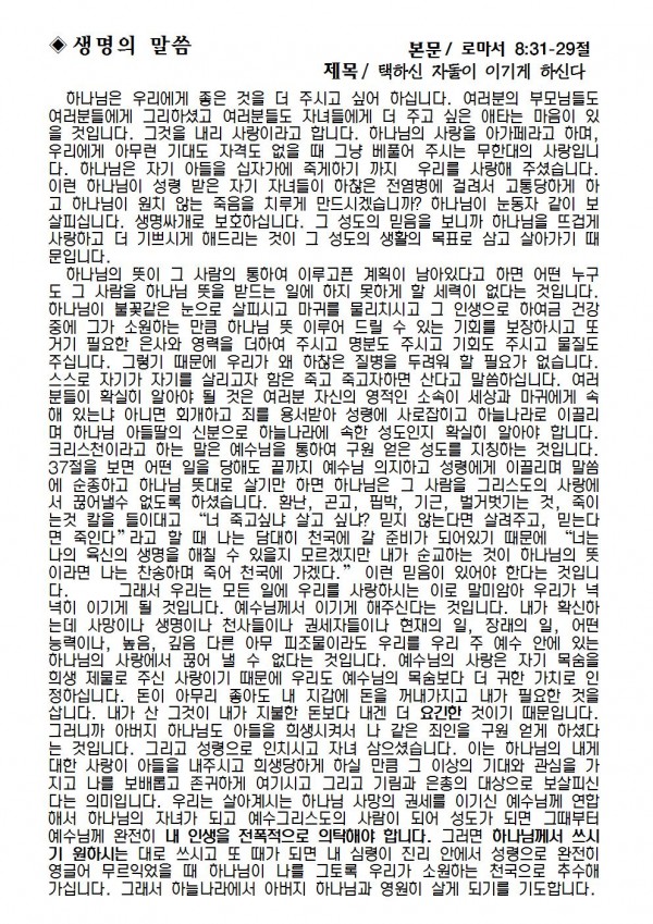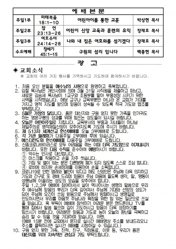 2020년 5월 3일 예배본문 & 교회소식 페이지 정보 작성자 성은교회 작성일20-05-01 16:19 조회7,187회 관련링크 이전글 다음글 목록 본문 2020년 5월 3일 예배본문 & 교회소식 이전글 다음글 목록