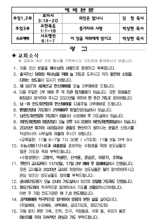 2019년 11월 3일 예배본문 & 교회소식 페이지 정보 작성자 성은교회 작성일19-11-01 14:03 조회7,976회 관련링크 이전글 다음글 목록 본문 2019년 11월 3일 예배본문 & 교회소식 이전글 다음글 목록
