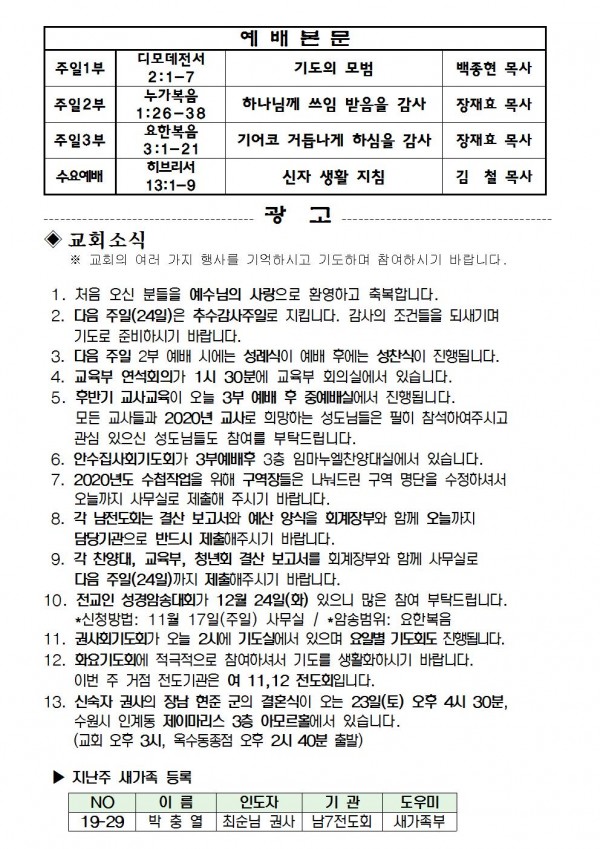 2019년 11월 17일 예배본문 & 교회소식 페이지 정보 작성자 성은교회 작성일19-11-15 17:08 조회7,810회 관련링크 이전글 다음글 목록 본문 2019년 11월 17일 예배본문 & 교회소식 이전글 다음글 목록