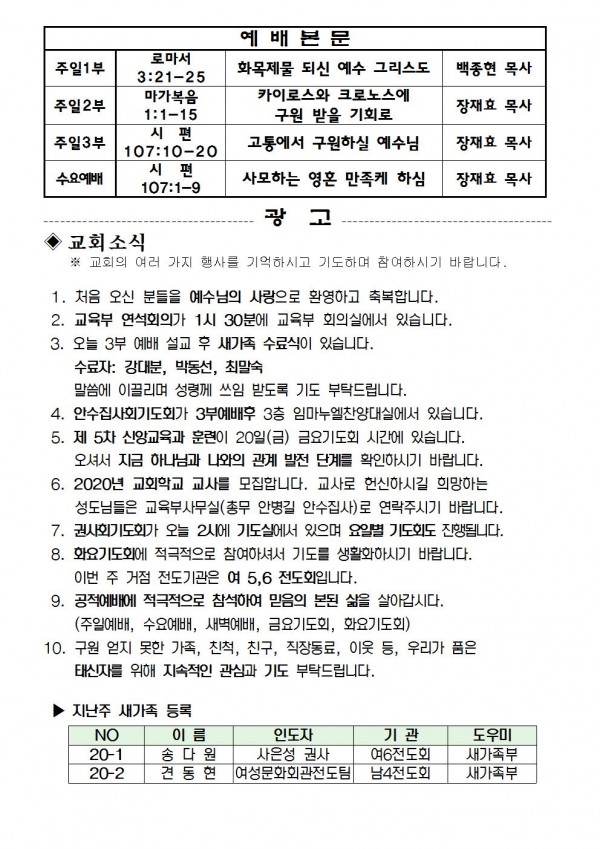 2019년 12월 15일 예배본문 & 교회소식 페이지 정보 작성자 성은교회 작성일19-12-13 17:10 조회7,577회 관련링크 이전글 다음글 목록 본문 2019년 12월 15일 예배본문 & 교회소식 이전글 다음글 목록