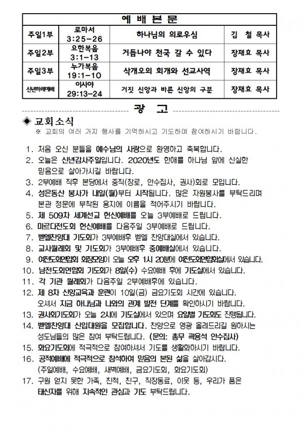 2020년 1월 5일 예배본문 & 교회소식 페이지 정보 작성자 성은교회 작성일20-01-03 15:04 조회7,561회 관련링크 이전글 다음글 목록 본문 2019년 1월 5일 예배본문 & 교회소식 이전글 다음글 목록