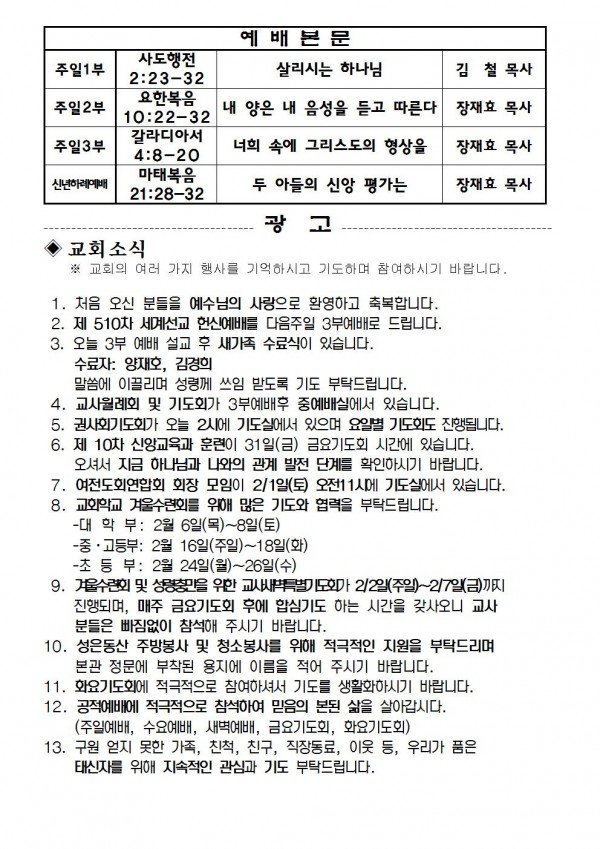 2020년 1월 26일 예배본문 & 교회소식 페이지 정보 작성자 성은교회 작성일20-01-25 13:32 조회7,376회 관련링크 이전글 다음글 목록 본문 2020년 1월 26일 예배본문 & 교회소식 이전글 다음글 목록