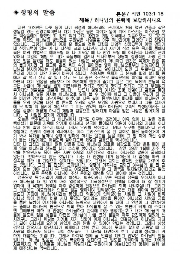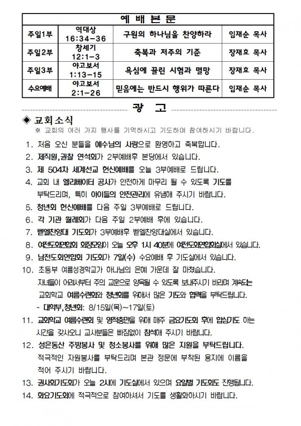 2019년 8월 4일 예배본문 & 교회소식 페이지 정보 작성자 성은교회 작성일19-08-02 15:18 조회8,259회 관련링크 이전글 다음글 목록 본문 2019년 8월 4일 예배본문 & 교회소식 이전글 다음글 목록