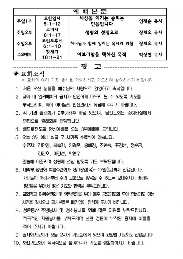 2019년 8월 11일 예배본문 & 교회소식 페이지 정보 작성자 성은교회 작성일19-08-09 15:46 조회8,265회 관련링크 이전글 다음글 목록 본문 2019년 8월 11일 예배본문 & 교회소식 이전글 다음글 목록