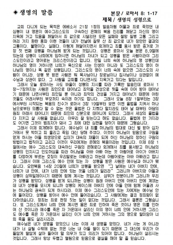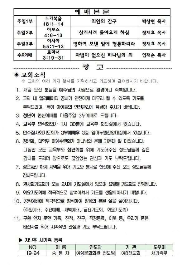 2019년 8월 18일 예배본문 & 교회소식 페이지 정보 작성자 성은교회 작성일19-08-16 16:18 조회8,185회 관련링크 이전글 다음글 목록 본문 2019년 8월 18일 예배본문 & 교회소식 이전글 다음글 목록