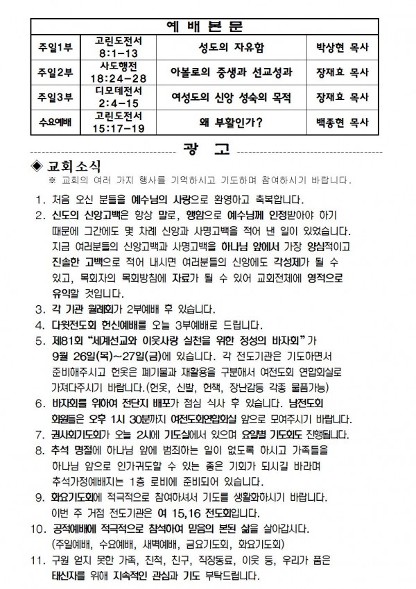 2019년 9월 8일 예배본문 & 교회소식 페이지 정보 작성자 성은교회 작성일19-09-06 16:29 조회8,300회 관련링크 이전글 다음글 목록 본문 2019년 9월 8일 예배본문 & 교회소식 이전글 다음글 목록