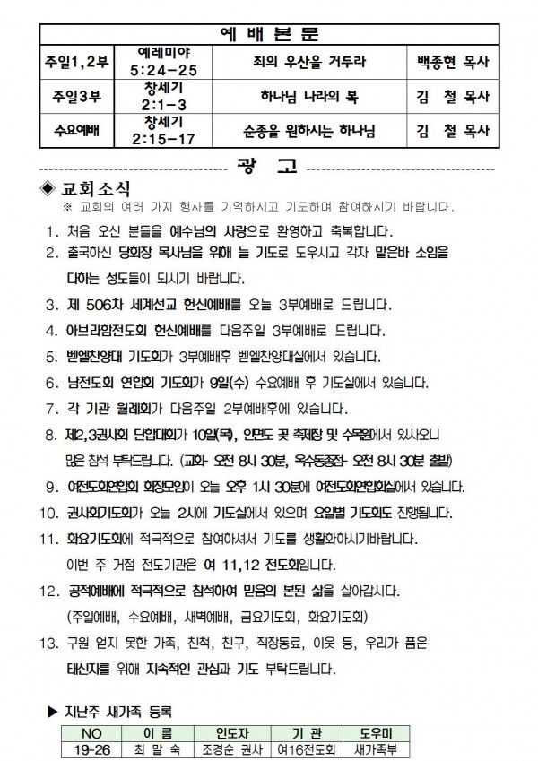 2019년10월 6일 예배본문 & 교회소식 페이지 정보 작성자 성은교회 작성일19-10-04 17:00 조회8,001회 관련링크 이전글 다음글 목록 본문 2019년10월 6일 예배본문 & 교회소식 이전글 다음글 목록