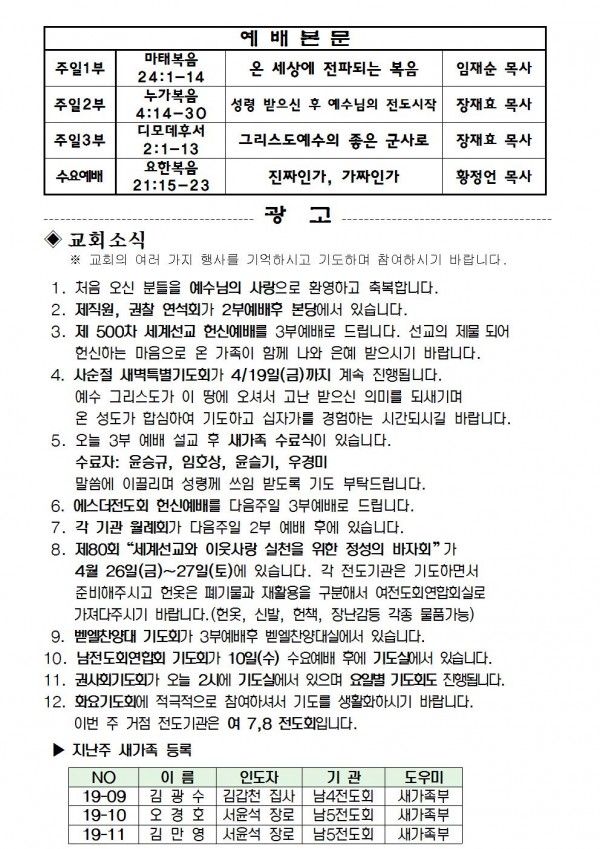 2019년 4월 7일 예배본문 & 교회소식 페이지 정보 작성자 성은교회 작성일19-04-05 17:04 조회8,482회 관련링크 이전글 다음글 목록 본문 2019년 4월 7일 예배본문 & 교회소식 이전글 다음글 목록