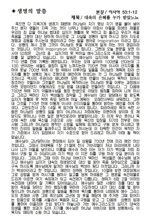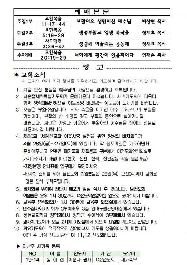 2019년 4월 21일 예배본문 & 교회소식 페이지 정보 작성자 성은교회 작성일19-04-19 18:37 조회8,317회 관련링크 이전글 다음글 목록 본문 2019년 4월 21일 예배본문 & 교회소식 이전글 다음글 목록