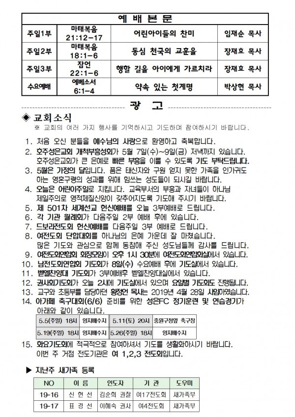 2019년 5월 5일 예배본문 & 교회소식 페이지 정보 작성자 성은교회 작성일19-05-04 09:59 조회8,231회 관련링크 이전글 다음글 목록 본문 2019년 5월 5일 예배본문 & 교회소식 이전글 다음글 목록