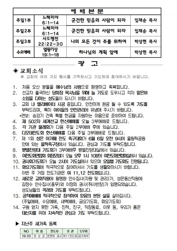 2019년 6월 2일 예배본문 & 교회소식 페이지 정보 작성자 성은교회 작성일19-05-31 16:29 조회8,179회 관련링크 이전글 다음글 목록 본문 2019년 6월 2일 예배본문 & 교회소식 이전글 다음글 목록