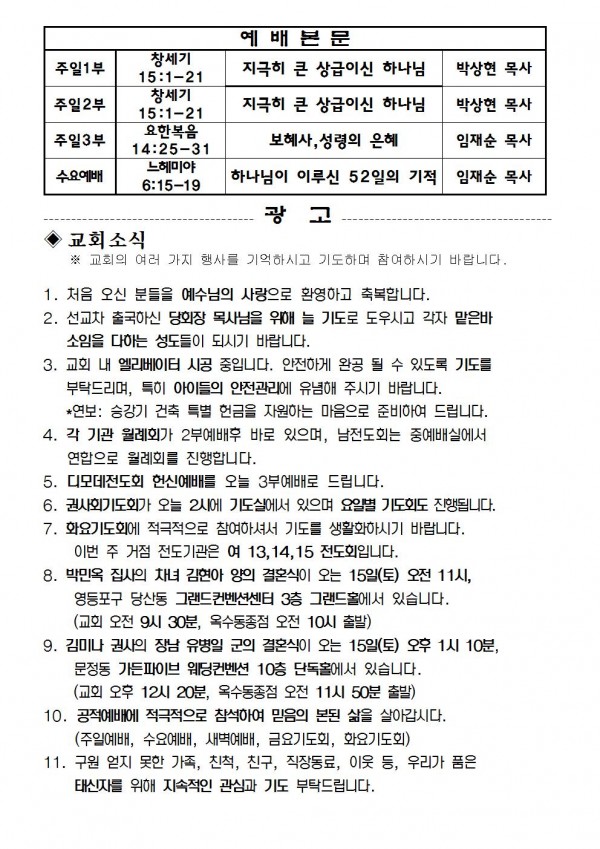2019년 6월 9일 예배본문 & 교회소식 페이지 정보 작성자 성은교회 작성일19-06-07 18:03 조회8,160회 관련링크 이전글 다음글 목록 본문 2019년 6월 9일 예배본문 & 교회소식 이전글 다음글 목록