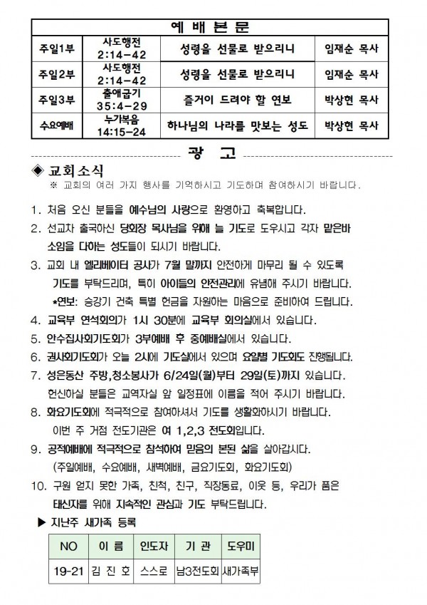 2019년 6월 16일 예배본문 & 교회소식 페이지 정보 작성자 성은교회 작성일19-06-14 17:12 조회8,202회 관련링크 이전글 다음글 목록 본문 2019년 6월 16일 예배본문 & 교회소식 이전글 다음글 목록