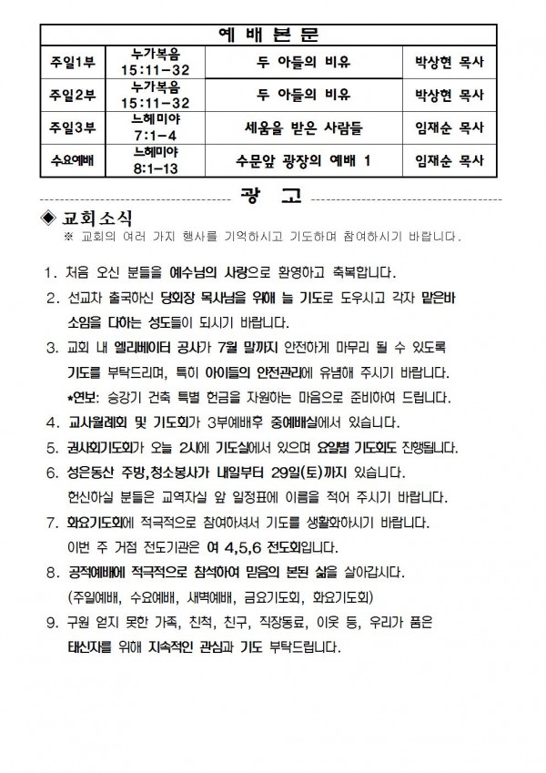 2019년 6월 23일 예배본문 & 교회소식 페이지 정보 작성자 성은교회 작성일19-06-21 17:46 조회8,259회 관련링크 이전글 다음글 목록 본문 2019년 6월 23일 예배본문 & 교회소식 이전글 다음글 목록