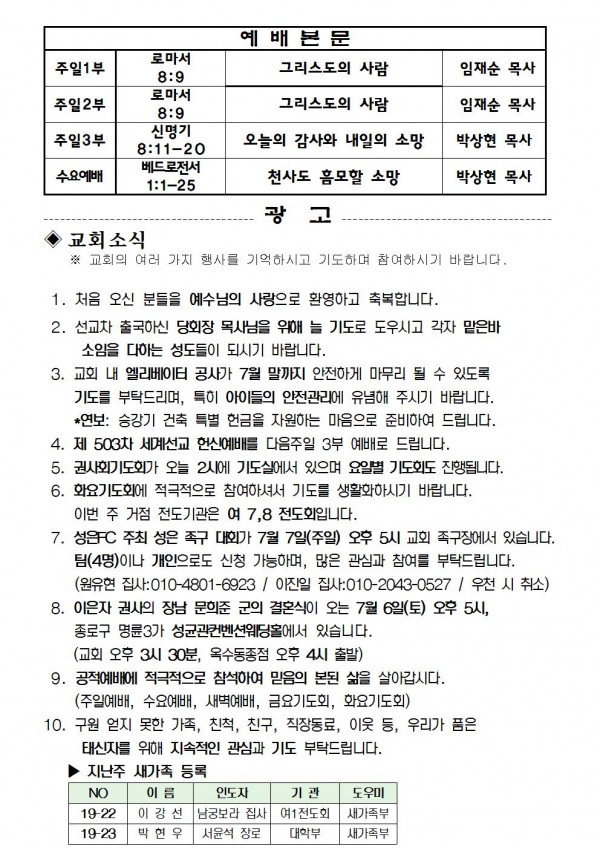 2019년 6월 30일 예배본문 & 교회소식 페이지 정보 작성자 성은교회 작성일19-06-28 15:38 조회8,292회 관련링크 이전글 다음글 목록 본문 2019년 6월 30일 예배본문 & 교회소식 이전글 다음글 목록