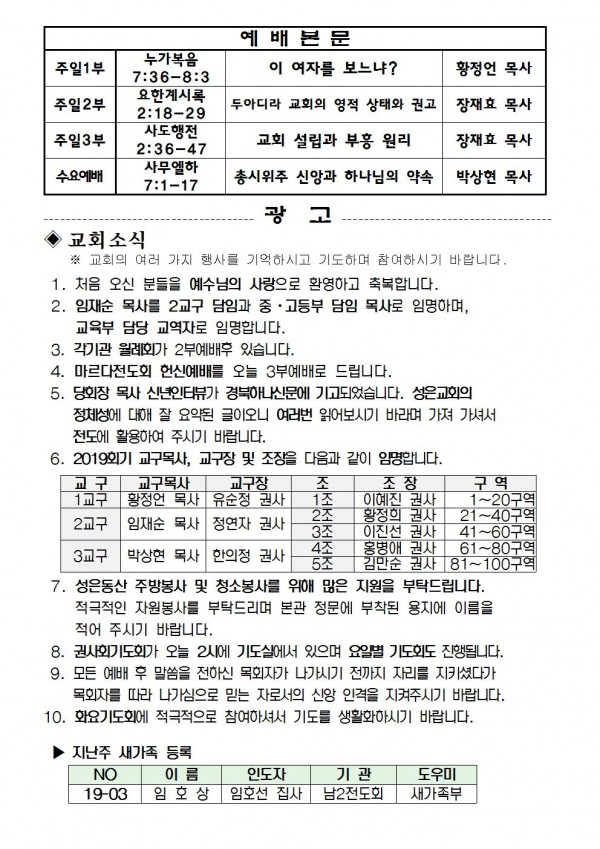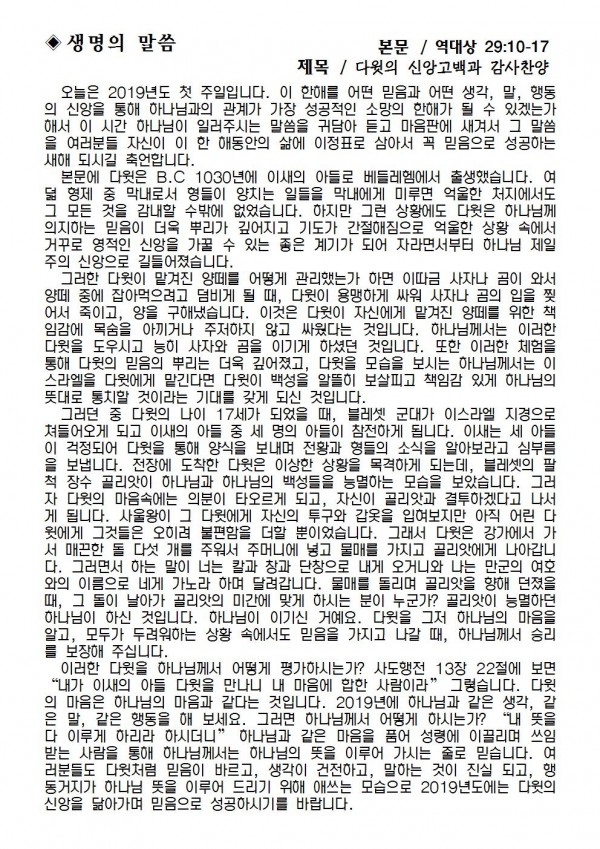 2019년 1월 13일 예배본문 & 교회소식 페이지 정보 작성자 성은교회 작성일19-01-12 10:49 조회8,166회 관련링크 이전글 다음글 목록 본문 2019년 1월 13일 예배본문 & 교회소식 이전글 다음글 목록