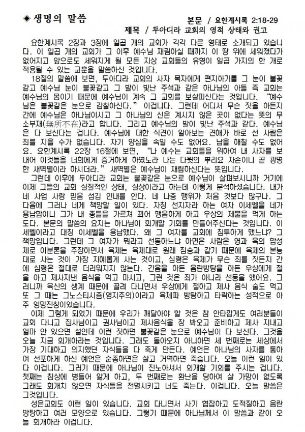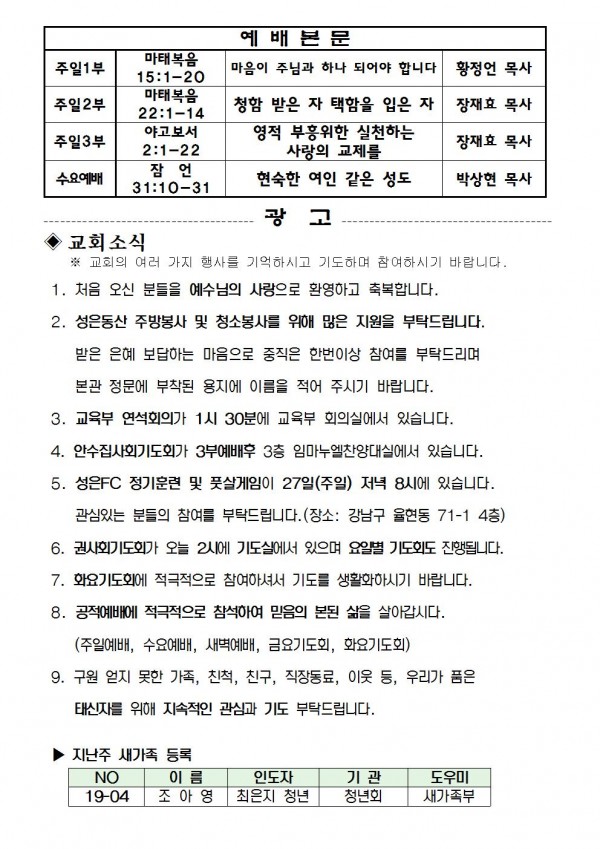 2019년 1월 20일 예배본문 & 교회소식 페이지 정보 작성자 성은교회 작성일19-01-18 16:02 조회8,042회 관련링크 이전글 다음글 목록 본문 2019년 1월 20일 예배본문 & 교회소식 이전글 다음글 목록