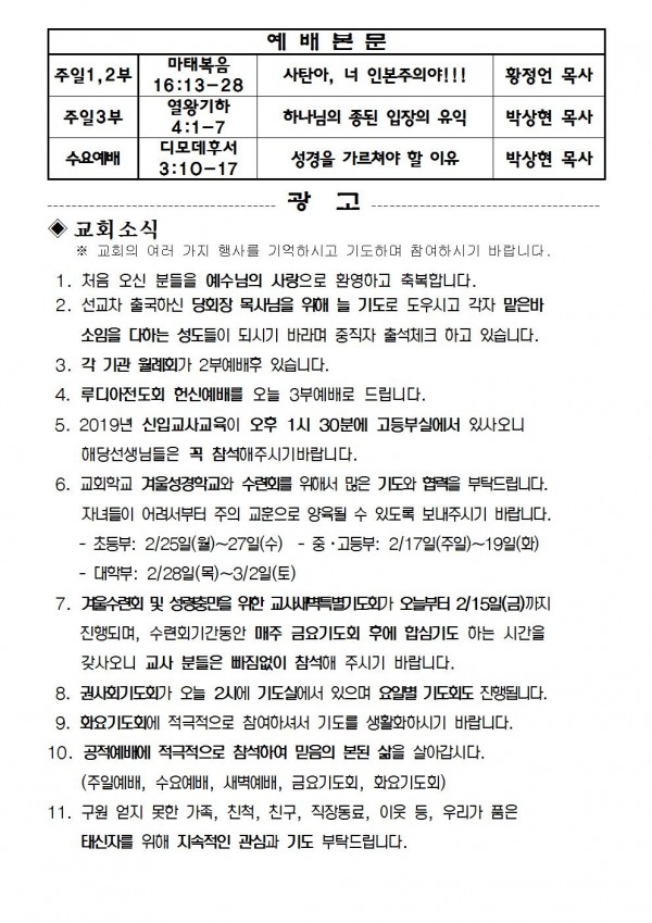 2019년 2월 10일 예배본문 & 교회소식 페이지 정보 작성자 성은교회 작성일19-02-08 14:51 조회7,965회 관련링크 이전글 다음글 목록 본문 2019년 2월 10일 예배본문 & 교회소식 이전글 다음글 목록