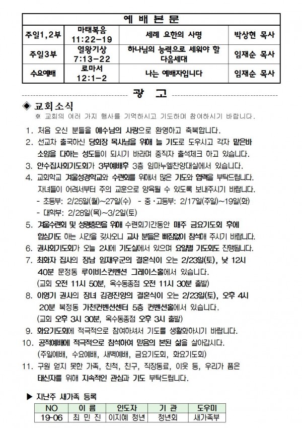 2019년 2월 17일 예배본문 & 교회소식 페이지 정보 작성자 성은교회 작성일19-02-15 14:38 조회8,016회 관련링크 이전글 다음글 목록 본문 2019년 2월 17일 예배본문 & 교회소식 이전글 다음글 목록