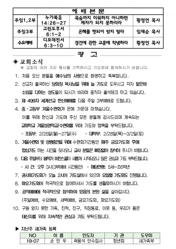 2019년 2월 24일 예배본문 & 교회소식 페이지 정보 작성자 성은교회 작성일19-02-22 15:48 조회7,995회 관련링크 이전글 다음글 목록 본문 2019년 2월 24일 예배본문 & 교회소식 이전글 다음글 목록