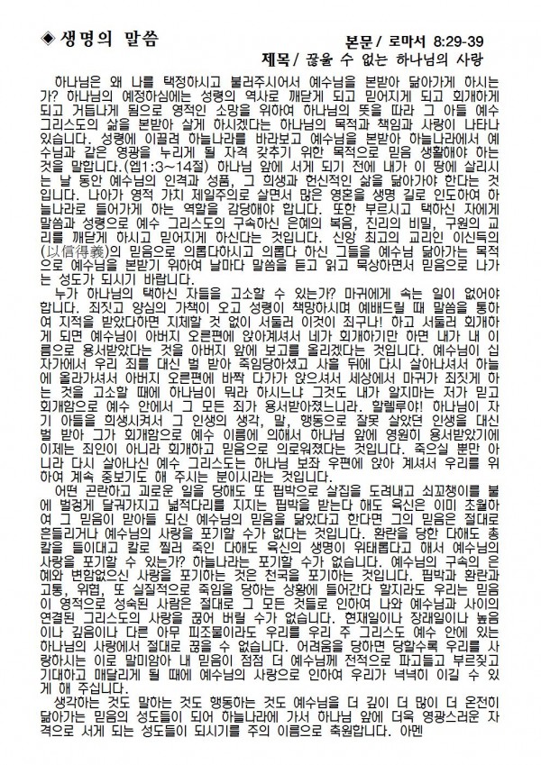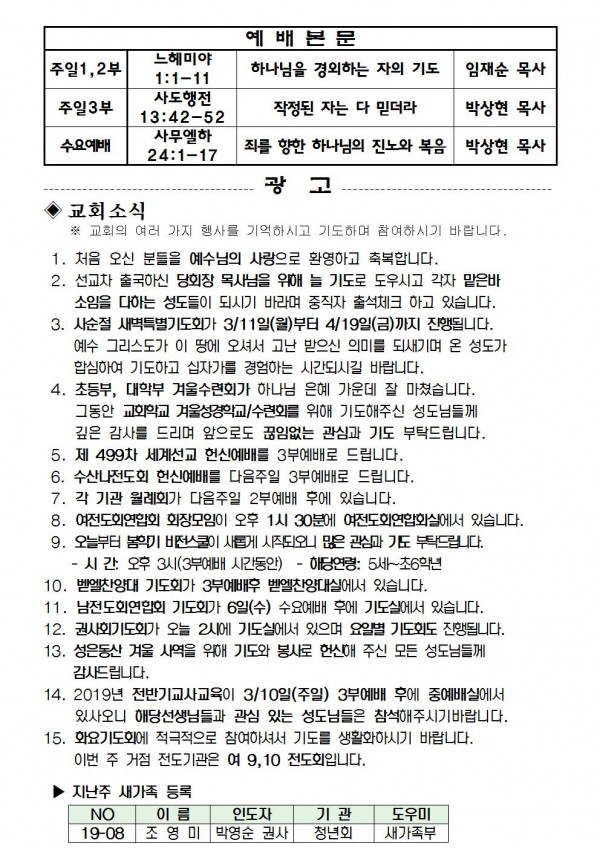 2019년 3월 3일 예배본문 & 교회소식 페이지 정보 작성자 성은교회 작성일19-03-01 11:55 조회8,136회 관련링크 이전글 다음글 목록 본문 2019년 3월 3일 예배본문 & 교회소식 이전글 다음글 목록