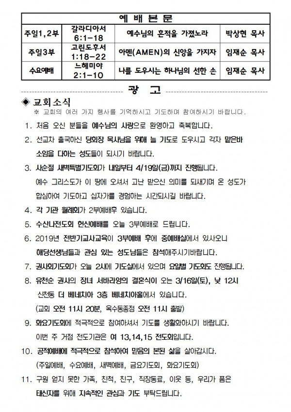 2019년 3월 10일 예배본문 & 교회소식 페이지 정보 작성자 성은교회 작성일19-03-08 17:12 조회8,054회 관련링크 이전글 다음글 목록 본문 2019년 3월 10일 예배본문 & 교회소식 이전글 다음글 목록