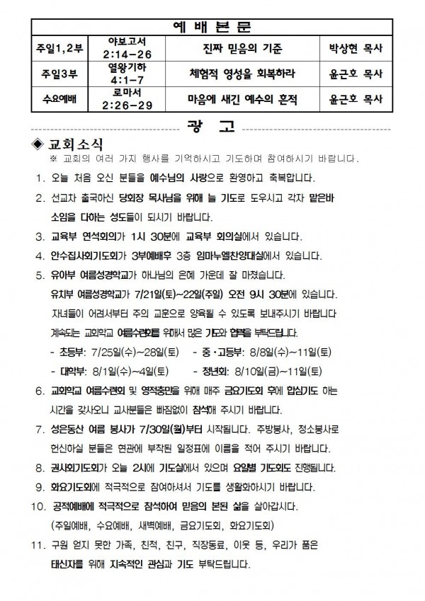 2018 년 7월 15일 예배본문 & 교회소식 페이지 정보 작성자 최고관리자 작성일18-07-13 15:53 조회7,780회 관련링크 이전글 다음글 목록 본문 2018 년 7월 15일 예배본문 & 교회소식 이전글 다음글 목록