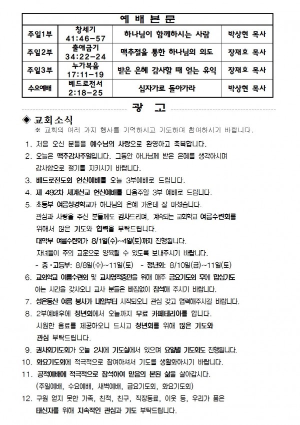 2018 년 7월 29일 예배본문 & 교회소식 페이지 정보 작성자 최고관리자 작성일18-07-27 15:48 조회7,967회 관련링크 이전글 다음글 목록 본문 2018 년 7월 29일 예배본문 & 교회소식 이전글 다음글 목록