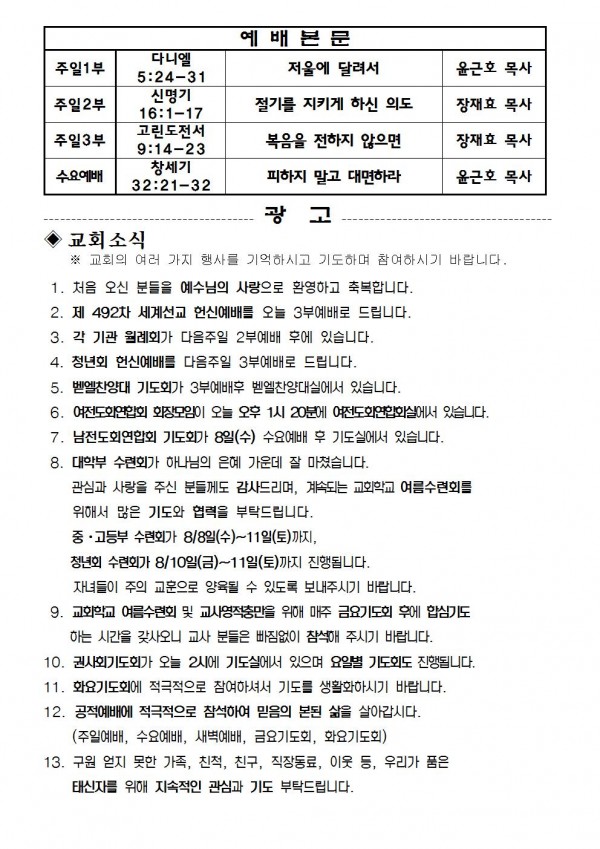 2018 년 8월 5일 예배본문 & 교회소식 페이지 정보 작성자 최고관리자 작성일18-08-03 18:44 조회7,969회 관련링크 이전글 다음글 목록 본문 2018 년 8월 5일 예배본문 & 교회소식 이전글 다음글 목록