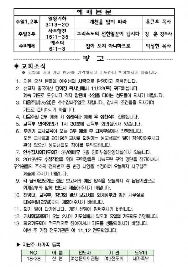 2018 년 11월 18일 예배본문 & 교회소식 페이지 정보 작성자 성은교회 작성일18-11-16 14:16 조회8,135회 관련링크 이전글 다음글 목록 본문 2018 년 11월 18일 예배본문 & 교회소식 이전글 다음글 목록