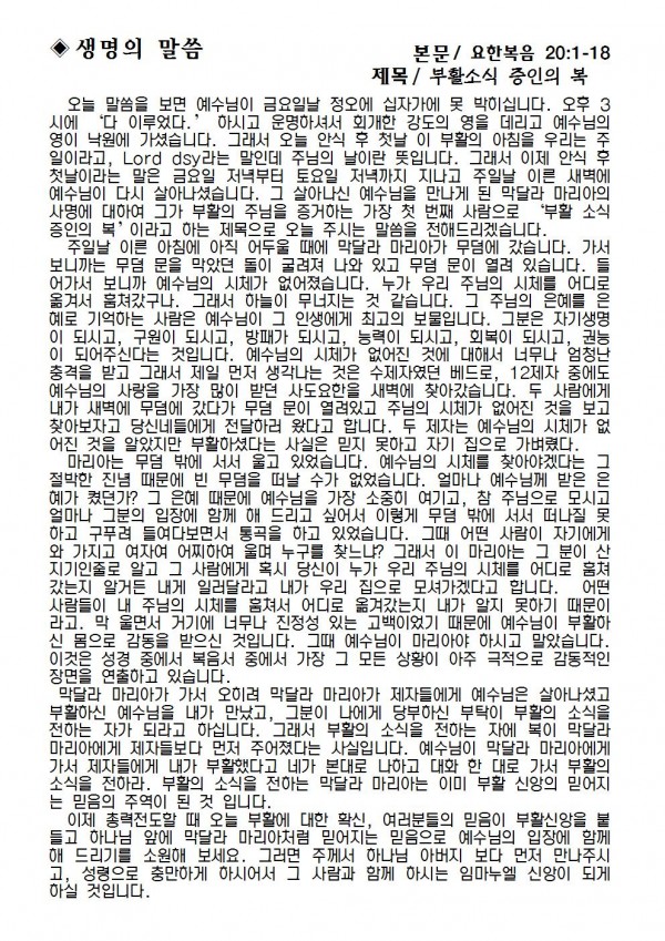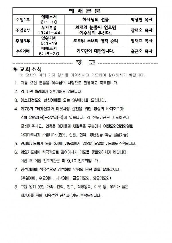 2018 년 4월 8일 예배본문 & 교회소식 페이지 정보 작성자 최고관리자 작성일18-04-06 16:45 조회8,194회 관련링크 이전글 다음글 목록 본문 2018 년 4월 8일 예배본문 & 교회소식 이전글 다음글 목록
