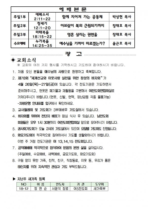 2018 년 4월 22일 예배본문 & 교회소식 페이지 정보 작성자 최고관리자 작성일18-04-20 14:57 조회8,229회 관련링크 이전글 다음글 목록 본문 2018 년 4월 22일 예배본문 & 교회소식 이전글 다음글 목록