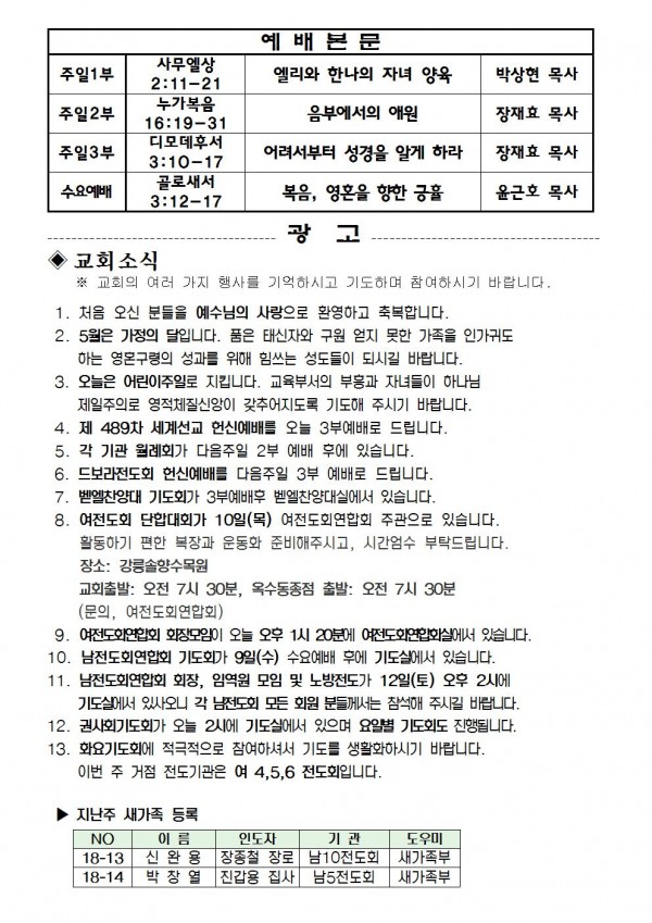2018 년 5월 6일 예배본문 & 교회소식 페이지 정보 작성자 최고관리자 작성일18-05-04 16:46 조회8,165회 관련링크 이전글 다음글 목록 본문 2018 년 5월 6일 예배본문 & 교회소식 이전글 다음글 목록