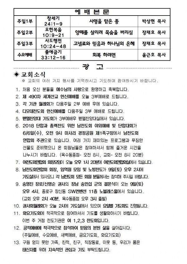 2018 년 6월 3일 예배본문 & 교회소식 페이지 정보 작성자 최고관리자 작성일18-06-01 18:02 조회8,011회 관련링크 이전글 다음글 목록 본문 2018 년 6월 3일 예배본문 & 교회소식 이전글 다음글 목록