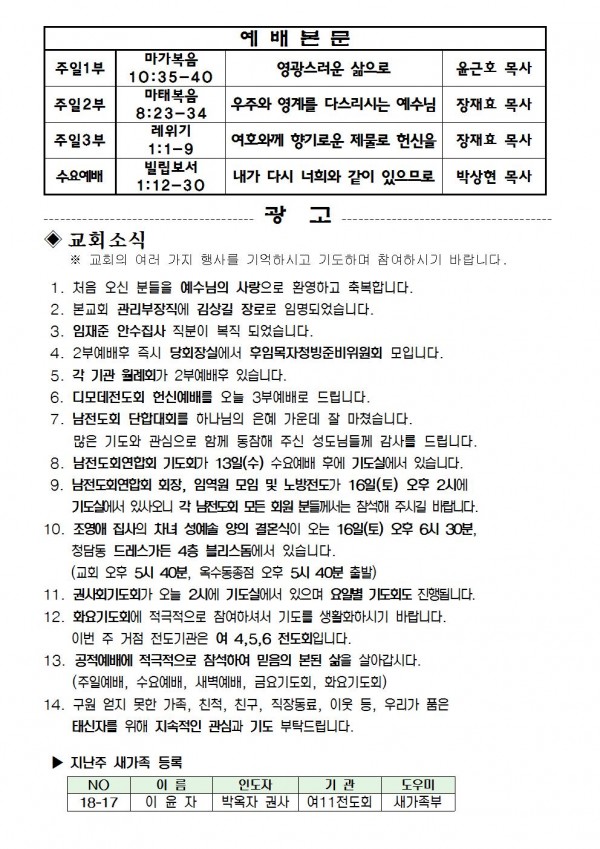 2018 년 6월10일 예배본문 & 교회소식 페이지 정보 작성자 최고관리자 작성일18-06-08 16:45 조회7,915회 관련링크 이전글 다음글 목록 본문 2018 년 6월10일 예배본문 & 교회소식 이전글 다음글 목록